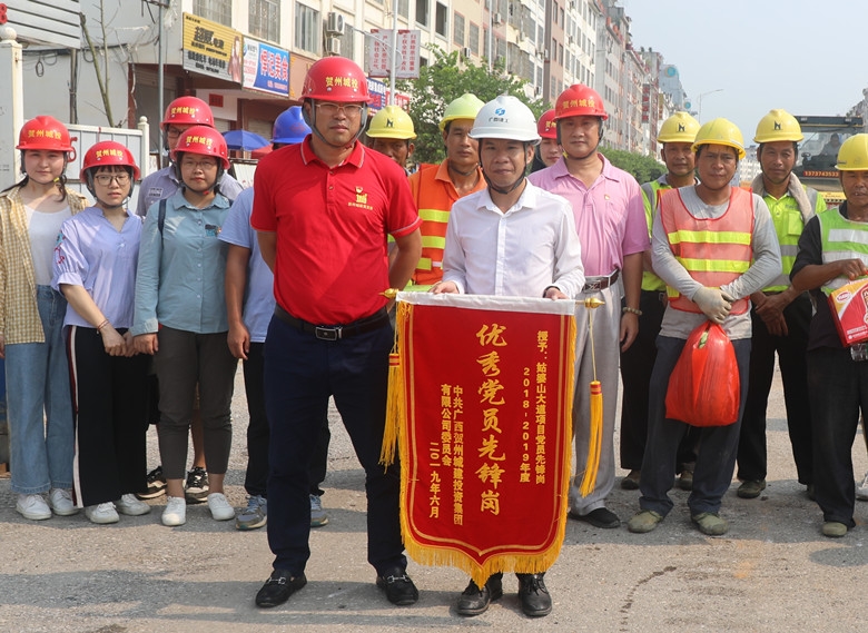 在項(xiàng)目現(xiàn)場(chǎng),蘭乾雄為戰(zhàn)斗在一線的工人們發(fā)放了西瓜、清涼飲料,并與工人代表拉起了家常,一一詢問(wèn)了工人的家庭、收入及工資發(fā)放等情況。他說(shuō)到,正是因?yàn)橛幸痪€工人們的努力和堅(jiān)守,我們的一些重點(diǎn)工程和項(xiàng)目才能順利向前推進(jìn),他們是最值得尊敬的人。同時(shí),蘭乾雄為姑婆山大道項(xiàng)目頒授了“2018-2019年度優(yōu)秀黨員先鋒崗”旗幟,肯定了他們?yōu)轫?xiàng)目建設(shè)的付出,鼓勵(lì)他們繼續(xù)充分發(fā)揮黨員先鋒崗先鋒模范作用。