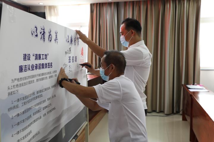 活動重溫了入黨誓詞,聘請各項目監(jiān)理單位人員為“廉政監(jiān)督員”,并在清廉工地承諾墻上開展集體簽名活動,立下高質量建設“清廉工地”的錚錚誓言。“廉政監(jiān)督員”們圍繞自身工作實際,談履職,話清廉,對“清廉工地”建設建言獻策,扎實推進黨建領廉、文化助廉等廉政建設。