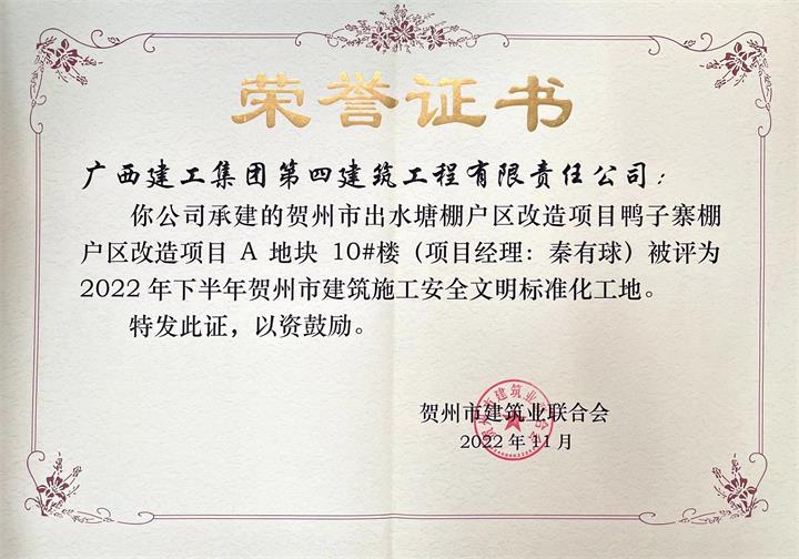 打造“高標(biāo)準(zhǔn)”文明工地。以標(biāo)準(zhǔn)化制度為主線,實(shí)現(xiàn)人員“進(jìn)場(chǎng)流程、安全檢查、安全設(shè)施、安全防護(hù)”標(biāo)準(zhǔn)化,建立13個(gè)在建項(xiàng)目微信交流群,每日?qǐng)?bào)送項(xiàng)目建設(shè)情況,全方位推進(jìn)文明工地建設(shè)。公司實(shí)施的平安居棚改項(xiàng)目、出水塘鴨子寨棚改項(xiàng)目均榮獲“2022年下半年賀州市建設(shè)工程施工安全文明標(biāo)準(zhǔn)化工地”。